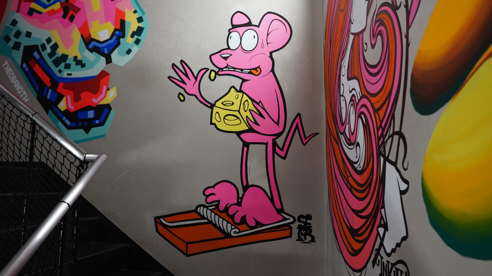 Sepr often illustrates humorous situations with clever wordplay and a very British sense of humor. At first glance, the mural feels light and playful, but the longer you look at it, the more layers and meaning appear. For this piece, Sepr used the same bold color palette as his graffiti partner Inkie, whose mural is located on the wall next to it, creating a visual dialogue between the two works.
