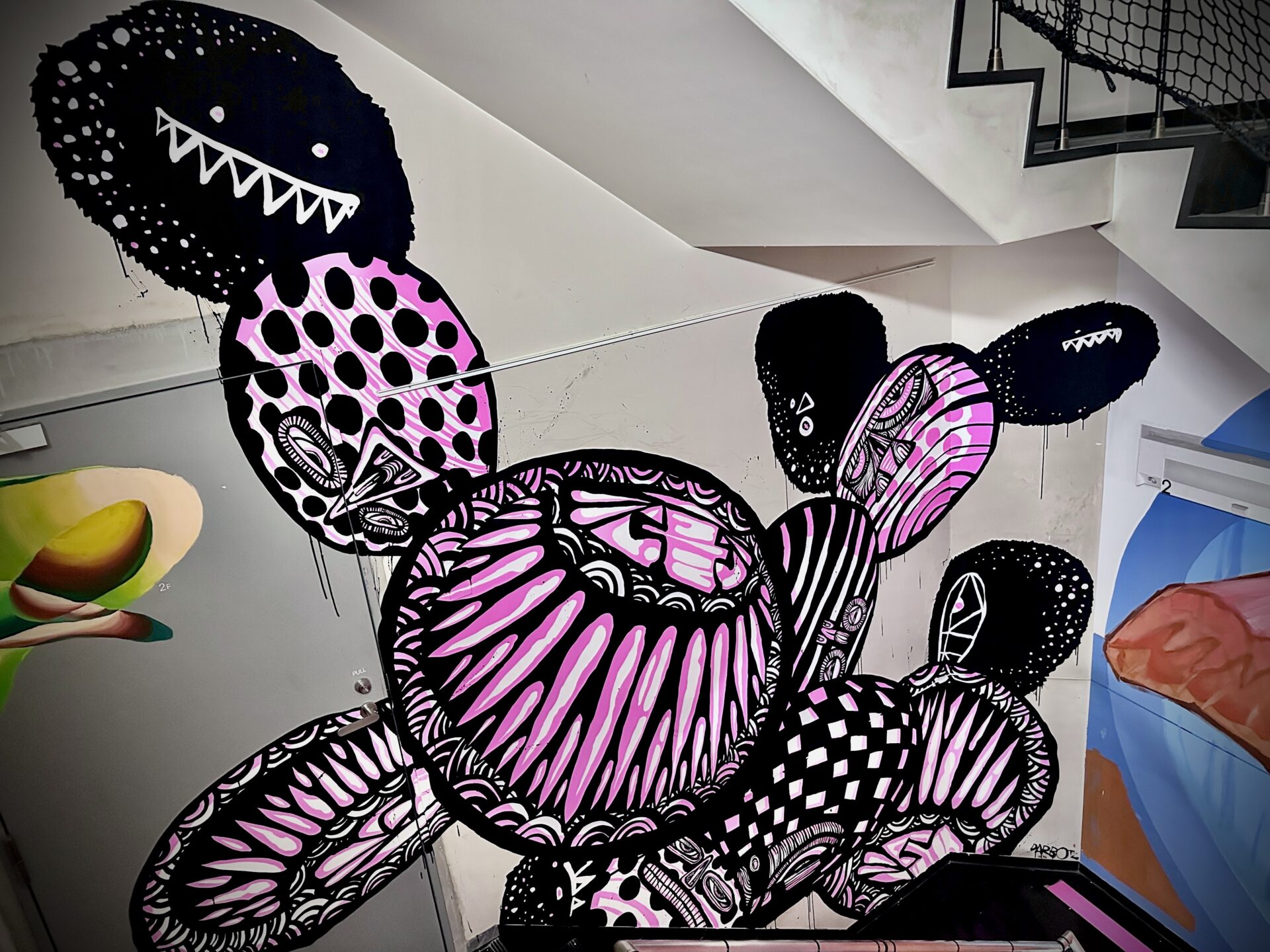 A fusion of monstrous heads stacked into one evolving form, this mural reflects the complex layers within every mind. Like molecules growing by absorbing new elements, our character is shaped by experience: travel, stories, cultures, and connections. Each head represents a piece of who we’ve become.