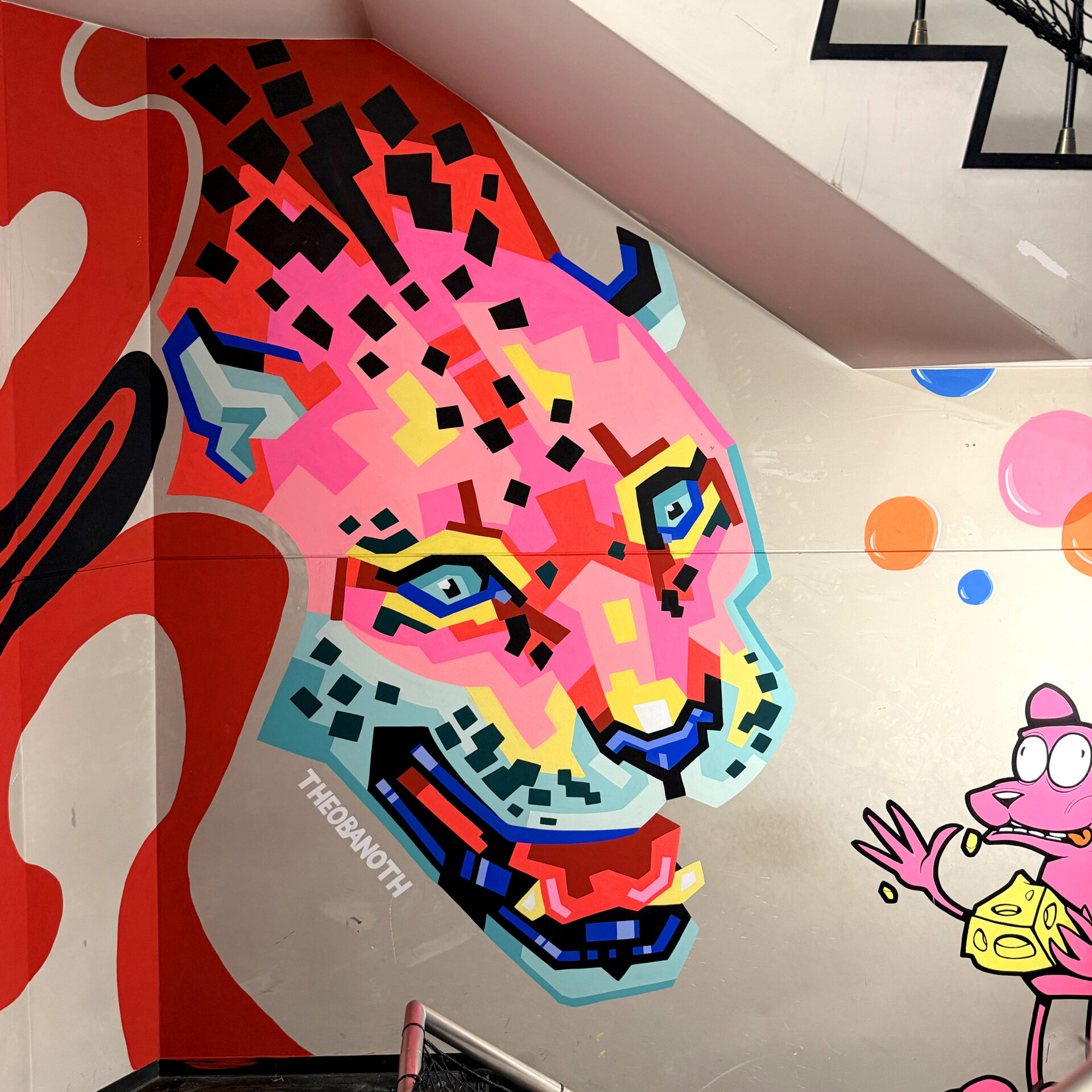 2026年のFusion Residencyの一環として、Theobanothは階段スペースに大きな豹の顔を描きました。捕食者である豹は、イギリス人アーティストSeprによる既存のネズミの作品と向かい合う位置に配置されており、2つの作品の間に明確な視覚的対話を生み出しています。この配置により、階段空間にさりげない緊張感が生まれ、空間の雰囲気が変化しました。